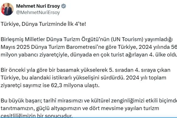 Kültür ve Turizm Bakanı Mehmet Nuri Ersoy, Türkiye’nin turizmdeki sürekli yükselişini değerlendirirken, “Birleşmiş Milletler Dünya Turizm Örgütü’nün verileri ışığında, Türkiye’nin dünya turizmindeki yeri güçlendi. 56,7 milyon yabancı ziyaretçi ile beşincilikten dördüncülüğe çıkarak bu alandaki başarımızı bir kez daha kanıtladık. 2024 yılı itibarıyla toplam ziyaretçi sayımız 62.3 milyon kişi olacak” dedi.