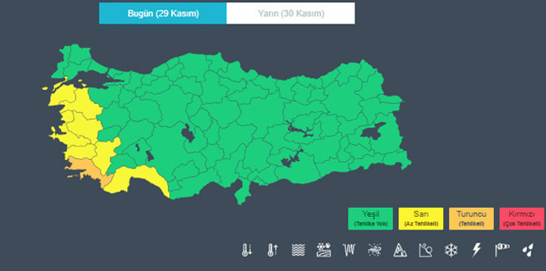 Meteoroloji, Muğla'ya yönelik turuncu, Antalya, Aydın, Balıkesir, Çanakkale, Denizli, İzmir ve Manisa illerine ise sarı kodlu alarm verdi.