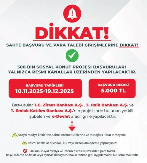 Bu geniş kapsamlı konut kampanyasında, proje başvuruları yalnızca Ziraat Bankası, Halk Bankası ve Emlak Katılım Bankası A.Ş.'nin yetkili şubeleri aracılığıyla ve e-Devlet üzerinden yapılabilecek. 10 Kasım-19 Aralık 2025 tarihleri arasında alınacak başvurunun ücreti 5.000 TL olarak belirlendi. Toplu Konut İdaresi Başkanlığı (TOKİ), 500 Bin Sosyal Konut Projesi kapsamındaki başvurular hakkında önemli bir uyarıda bulundu. TOKİ; sosyal medya platformlarında ve sahte internet sitelerinde yer alan bağlantılara kesinlikle güvenilmemesi gerektiğini vurguladı. Ayrıca, resmi bankalar dışında hiçbir kişi veya hesap için ödeme yapılmaması konusunda dikkatli olunması gerektiği belirtildi. Açıklamada, TOKİ'nin sosyal medya hesapları ve resmi internet sitesi dışındaki platformlardan başvuru veya kayıt alınmadığına dikkat çekilerek, “Vatandaşlarımızın mağduriyet yaşamamaları için yalnızca resmî kanalları kullanmaları önemle rica olunur” denildi.