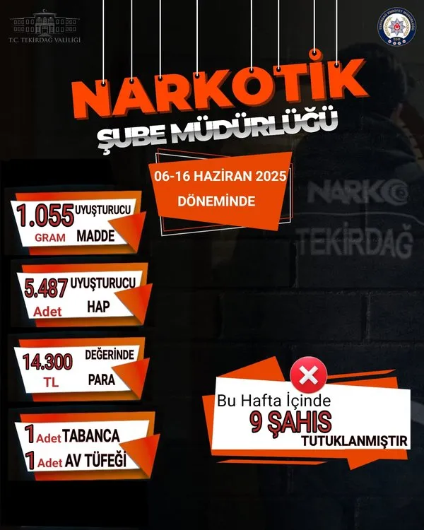 09 – 16 Haziran 2025 tarihleri arasında, uyuşturucu madde kullanan ve satan bireylere yönelik gerçekleştirilen operasyonlarda, toplamda 1 Kilo 55 Gram çeşitli uyuşturucu madde, 5487 adet uyuşturucu hap, 1 adet tabanca, 1 adet av tüfeği ve 14.300 TL nakit para ele geçirildi. Bu kapsamda, bir hafta içinde 9 kişiye tutuklama kararı verildi.