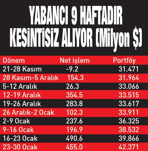 Yabancı yatırımcıların hisse senedi piyasasına ilgisi, Merkez Bankası'nın haftalık verilerine de yansıdı. Yabancı yatırımcılar, 23-30 Ocak haftasında hisse senedi piyasasında 455 milyon dolarlık net alım yaptı. Bu sayede hisse senedi piyasasındaki yabancı girişi üst üste dokuzuncu haftaya ulaşarak, bu dokuz haftada kümülatif yabancı alımı 2.3 milyar dolara çıktı. Yabancıların hisse senedi portföyü 42.3 milyar dolarla tarihi zirveye ulaştı.