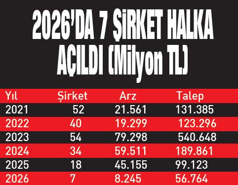 2025 yılında 18 şirketin 45.1 milyar lira büyüklüğünde halka arz gerçekleştirdiği Borsa İstanbul, 2026 yılına da hızlı bir başlangıç yaptı. Sermaye Piyasası Kurulu verilerine göre, şu ana kadar 7 şirket halka arz gerçekleştirdi. Bu halka arzların büyüklüğü 8 milyar 245 milyon lira olurken, gelen talep 57 milyar liraya dayandı. Geçen hafta Ata Turizm de halka arz için başvuruda bulundu. Sermaye artırımı ve ortak satışı yoluyla gerçekleştirilecek halka arzda, şirketin yüzde 34.87'sini oluşturan 280 milyon adet hisse 11.2 liradan halka arz edilecek. Halka arzın toplam büyüklüğü 3 milyar 136 milyon lira olması bekleniyor.