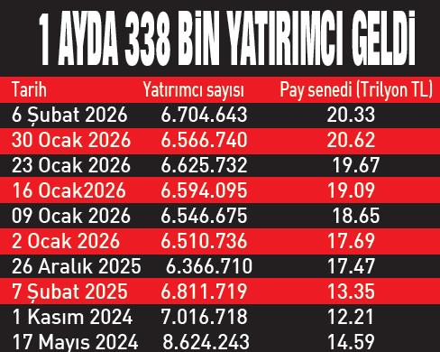 Borsa İstanbul'da geçen yıl yaşanan enflasyonun altında kalan performans ve uzun süre yatay hareket eden endeks, yatırımcıların piyasadan çıkmasına neden oldu. 17 Mayıs 2024 tarihinde 8 milyon 624 bin olan yatırımcı sayısı, 2025 sonuna gelindiğinde 6 milyon 366 bine düştü. Bu süre zarfında 2 milyon 257 bin yatırımcı piyasadan çekilmişti. Endeksin 2026 yılına hızlı bir başlangıç yapması ve artan halka arzlar sayesinde, yatırımcı sayısı 6 haftada yaklaşık 338 bin kişi artarak 6 milyon 714 bine ulaştı.
