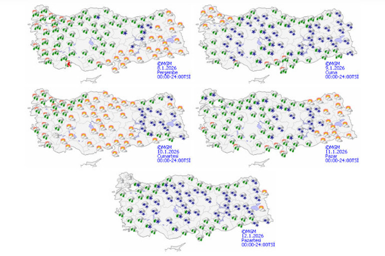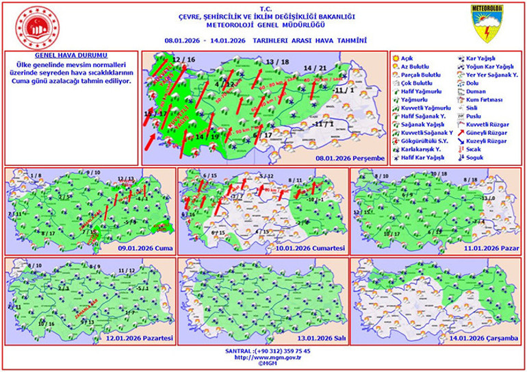 Meteoroloji Genel Müdürlüğü'nün güncel tahminlerine göre, Türkiye'nin genelinde parçalı ve çok bulutlu bir hava durumu hakim olacak. Marmara, Ege, Akdeniz, İç Anadolu, Karadeniz, Doğu Anadolu ile Gaziantep, Kilis, Adıyaman ve Diyarbakır çevrelerinde yağışlar bekleniyor. Hava sıcaklıklarının 10 derecelik bir düşüş göstermesiyle birlikte yeni bir soğuk hava dalgasının etkili olması öngörülüyor. Bugünden itibaren başlayacak olan bu soğuk hava, gelecek haftaya kadar devam edecek gibi görünüyor.