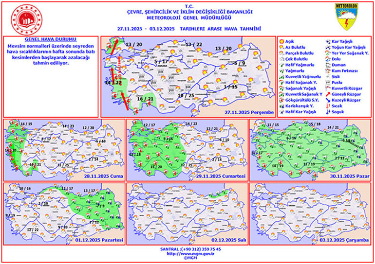 Mevsim normallerinin üzerinde seyreden hava sıcaklıklarının ilerleyen günlerde düşmesi bekleniyor. Rüzgar ise genellikle güneyli, Güneydoğu Anadolu'da kuzeyli yönlerden hafif ve ara sıra orta kuvvette, Marmara'nın batısı ve Kıyı Ege'de yer yer kuvvetli (40-60 km/saat) olacağı tahmin ediliyor.